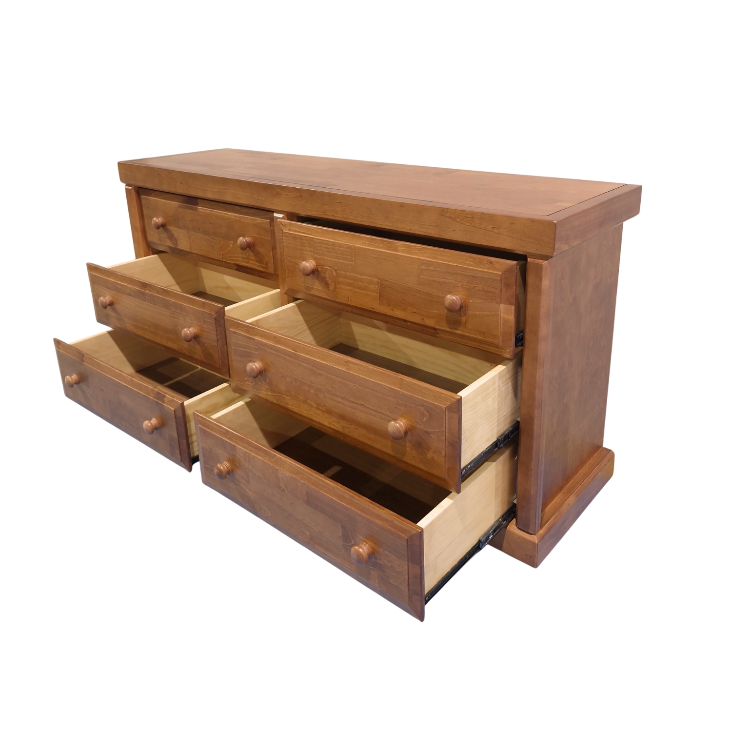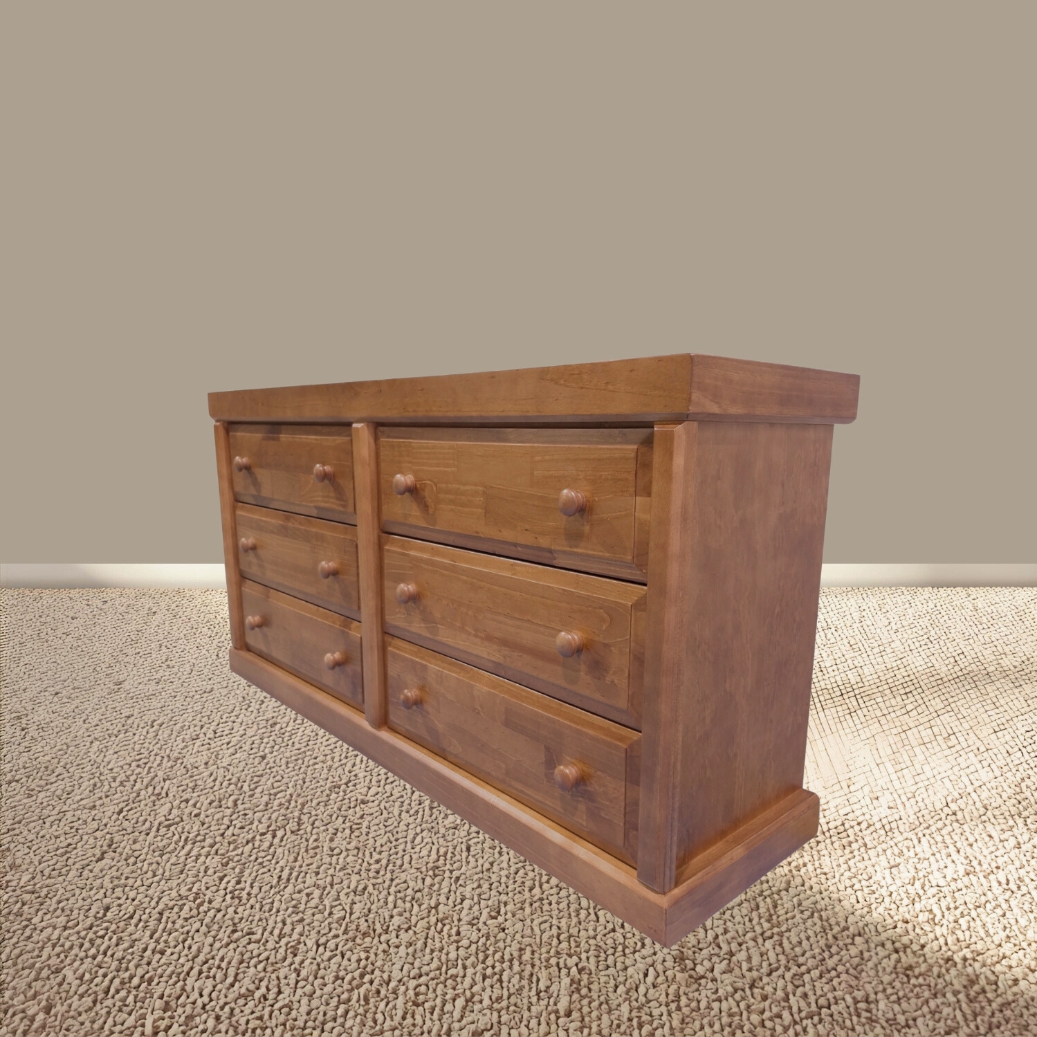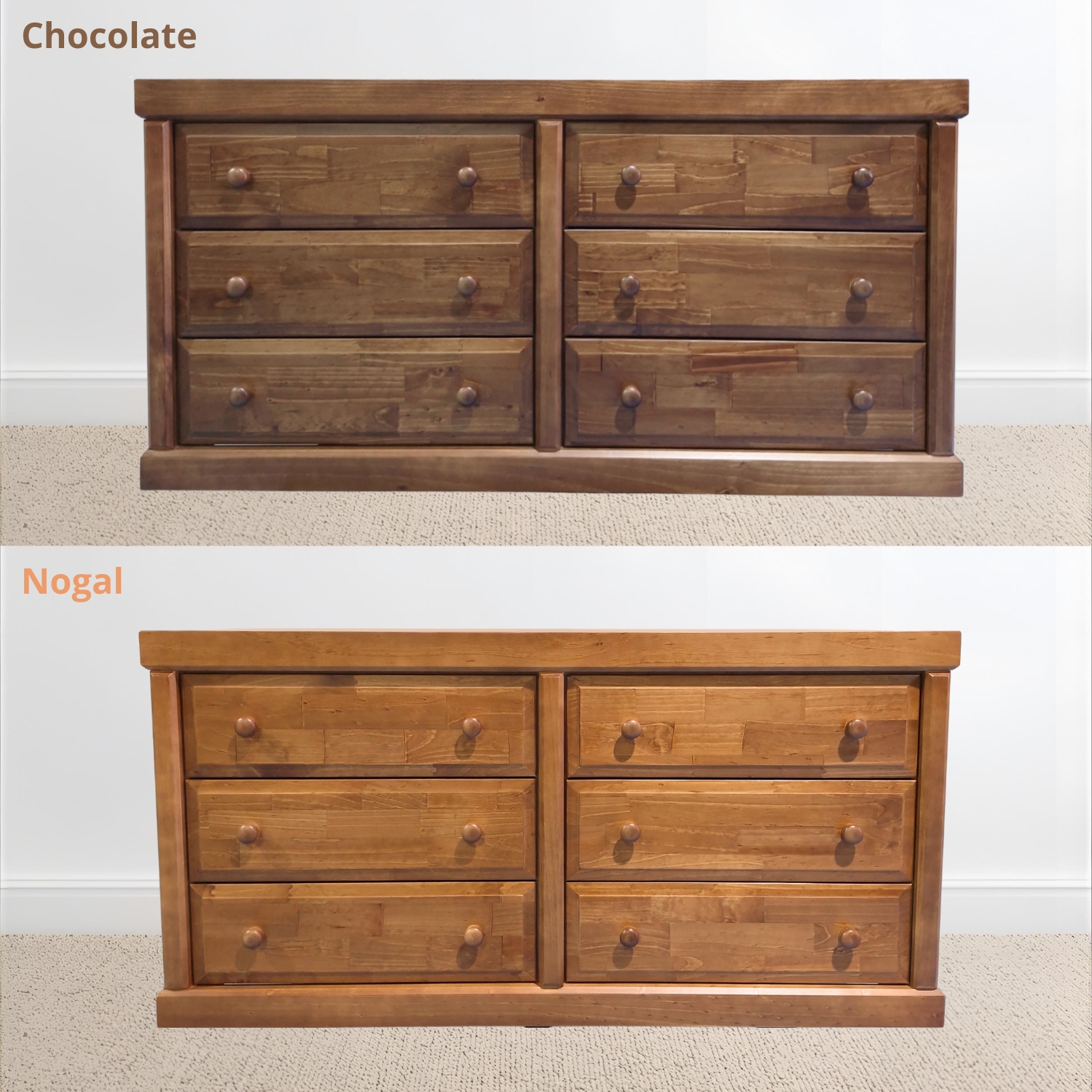 Cómoda Victoria 6 Cajones Pintada Color Nogal con cajones de terciado enlacados, tirador de madera torneado por artesanos de Temuco. Mueble armado muy firme