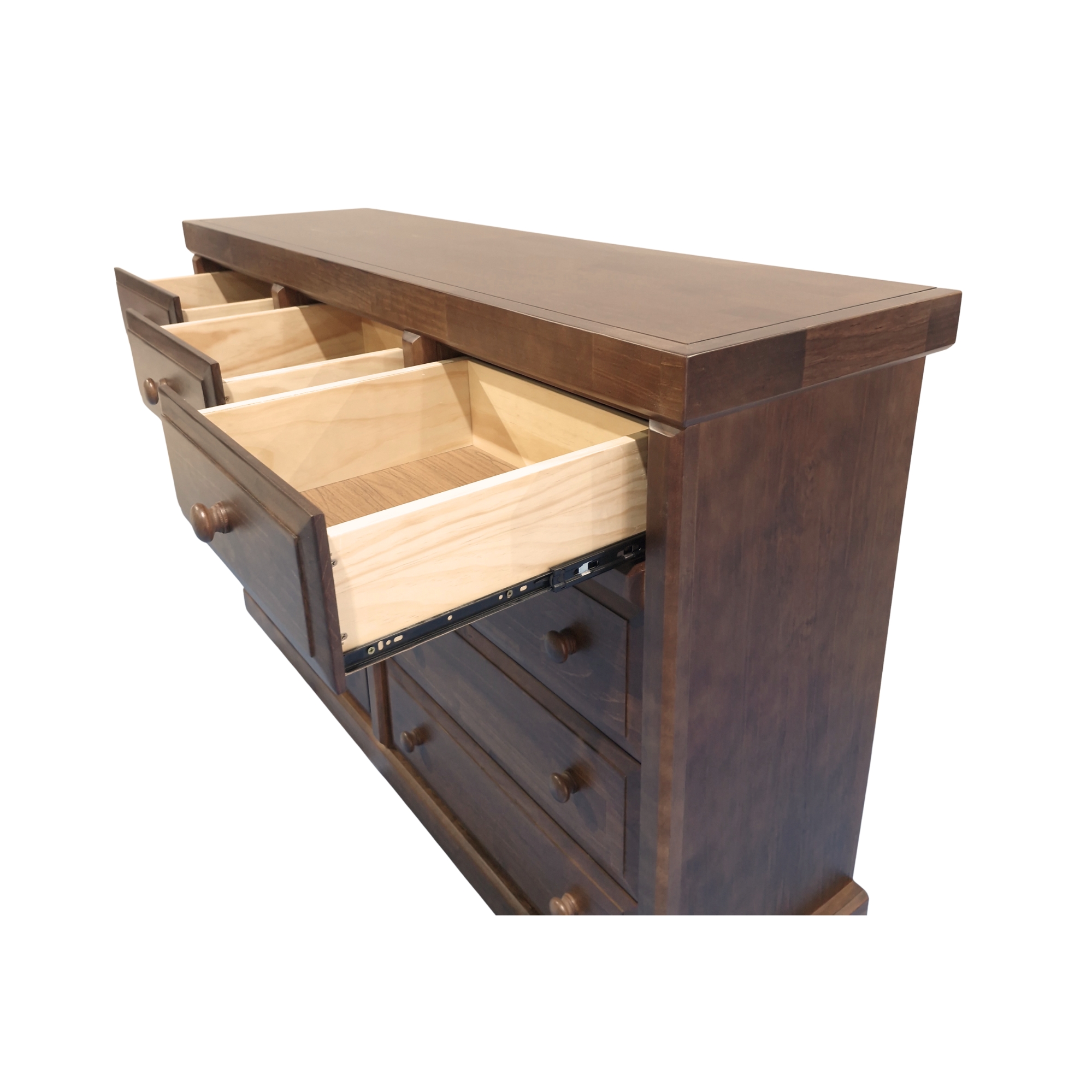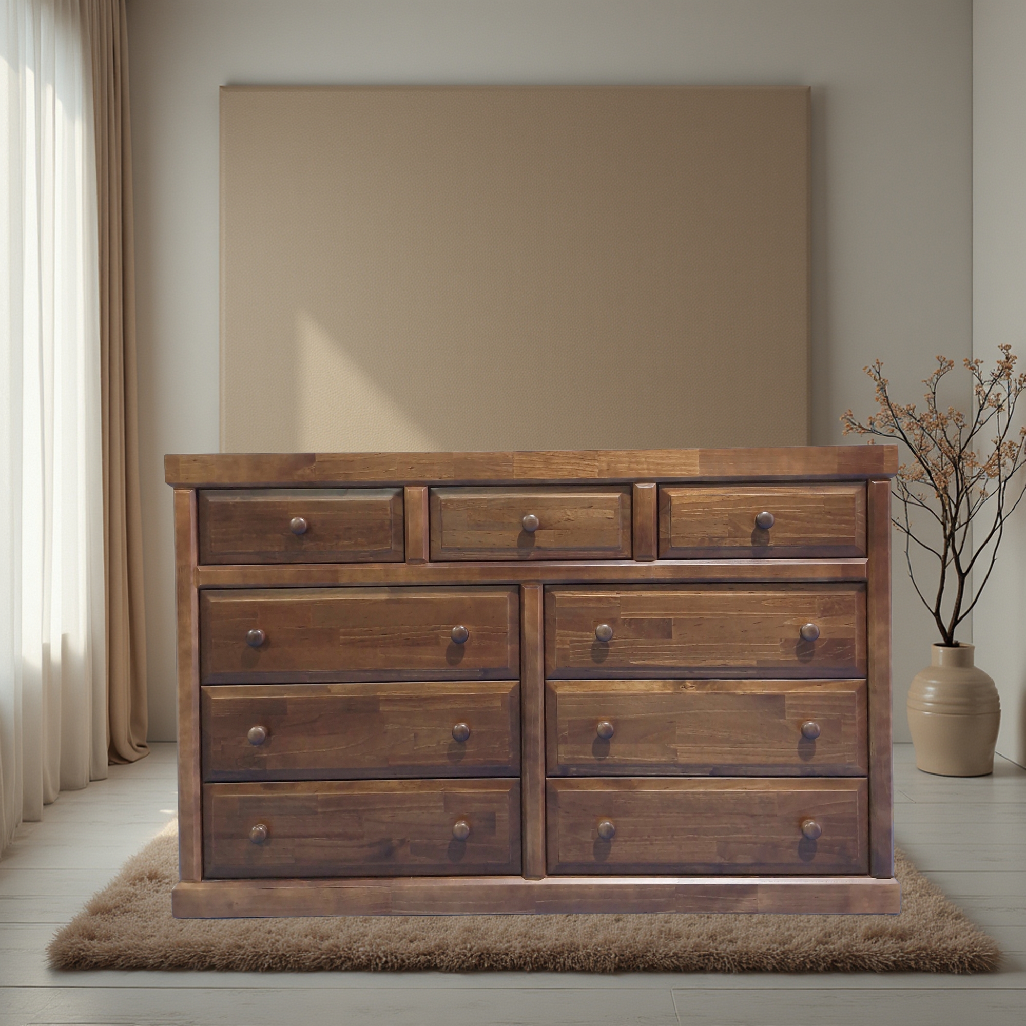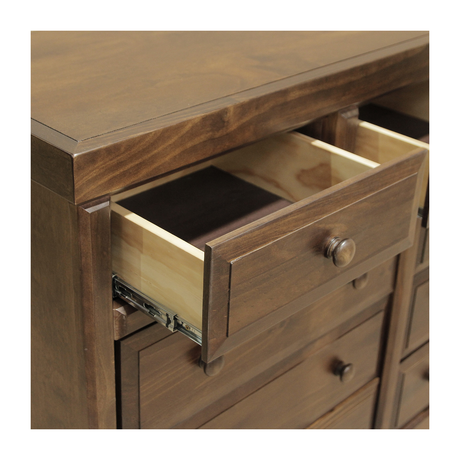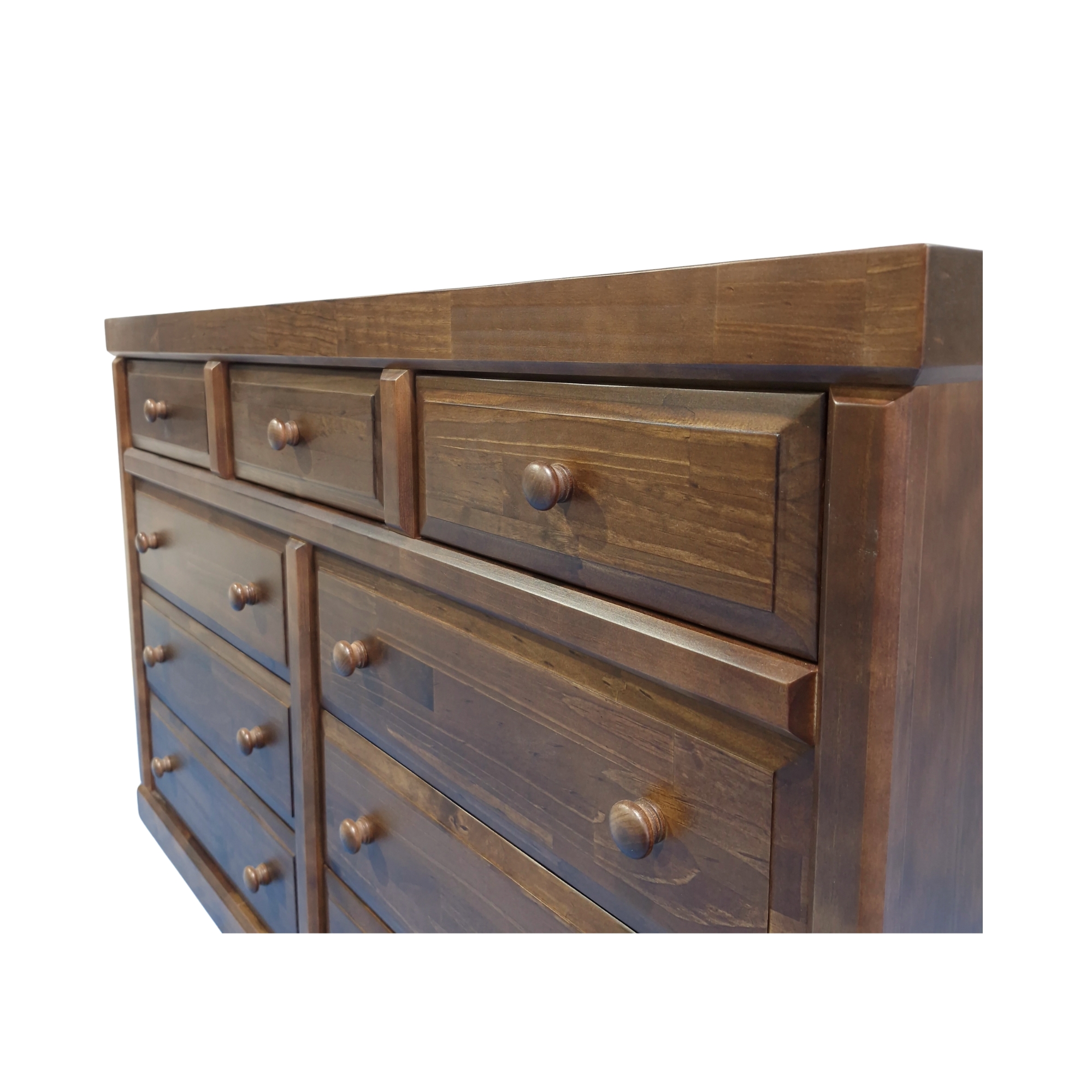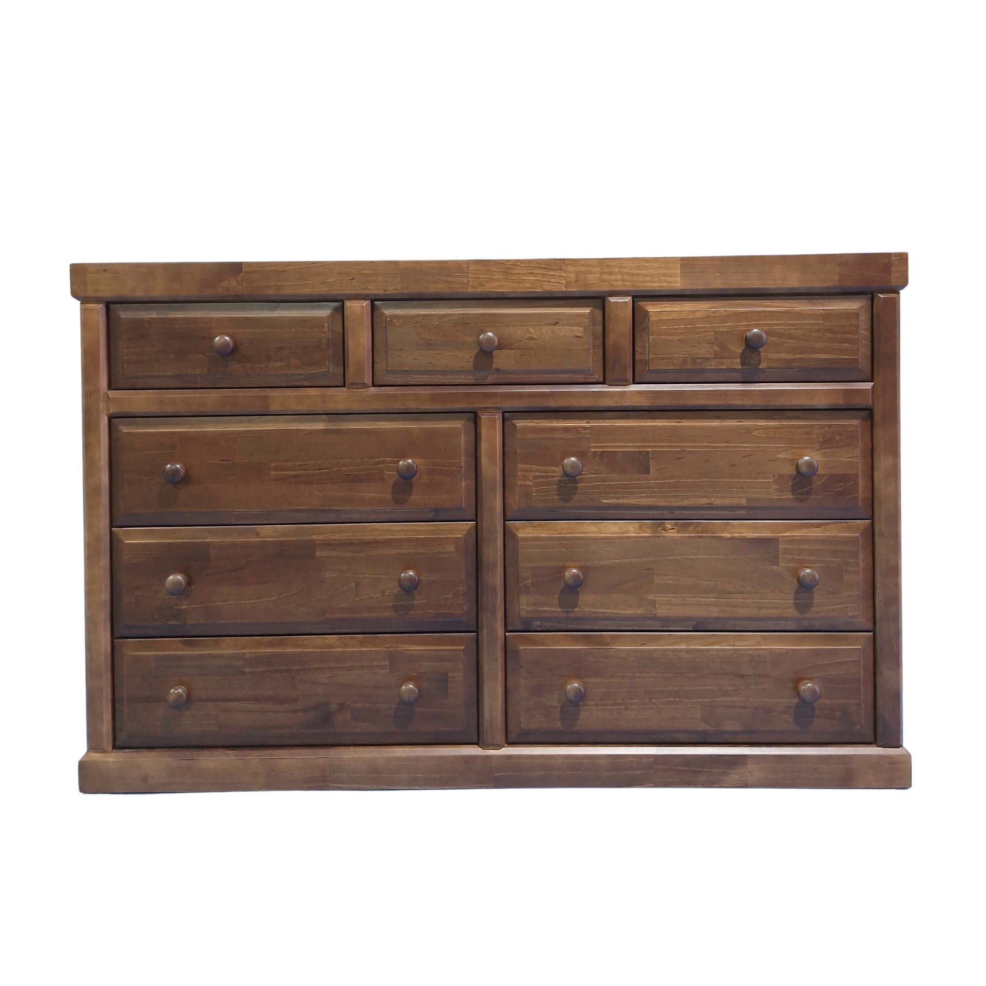Cómoda Victoria chocolate con 9 cajones de corredera metálica telescópicas. Firme y Elegante mueble fabricado en madera de pino radiata y terciado Master mueblería. tirador de madera torneado.